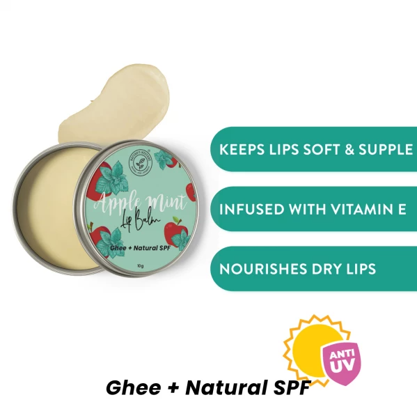 Our very own unique flavored lip balm with Apple mint in it. It has Rosehip Oil and Carrot Seed Oil which acts as natural SPF and will protect your lips from UV rays. This lip balm contains Ghee, Avocado oil and Sweet Almond oil which will keep your lips soft and hydrated and will add a natural shine to your lips.