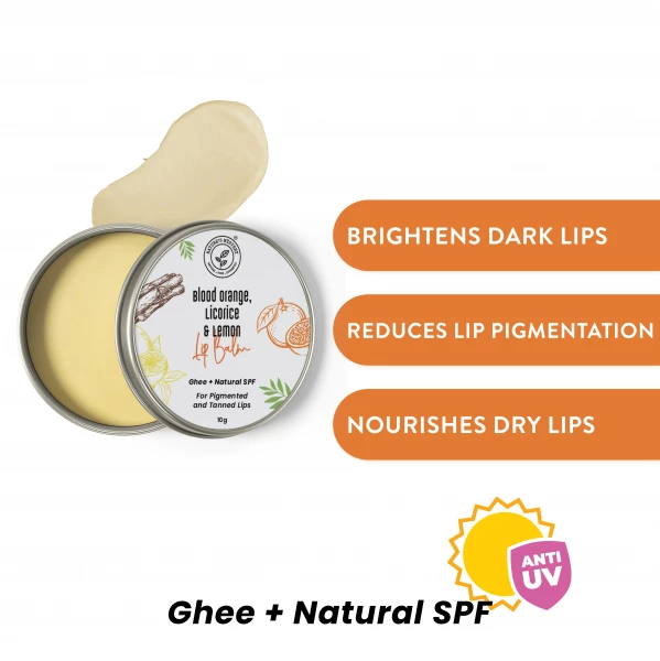 Our Bestseller Lip Balm! This lip balm helps reduces pigmentation of lips and lightens lip color as it has natural lightening agents like Blood Orange oil, Licorice Oil, Vitamin C enriched Lemon Oil and Rosehip Oil. Made with Ghee and has Carrot Seed Oil and Raspberry Seed Oil which acts as Natural SPF and helps protect lips from UV rays.