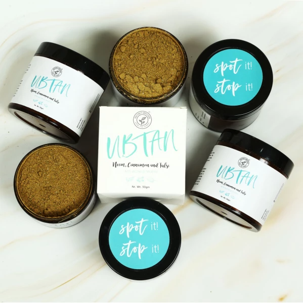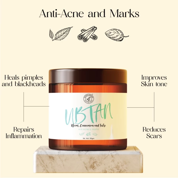 Packed with natural anti-bacterial, antioxidant and anti infl ammatory ingredients which calms your skin and are helpful in treating acne, pimples and breakouts. Ingredients like Neem, Tulsi, Cinnamon, Masoor Dal fi ght the bacteria and prevent acne while Multani Mitti and Vitamin E calmsdown the irritated skin. This ubtan is a perfect blend to fi ght acne, reduce dark spots and blemishes and improve skin tone. An effective spottreatment for clear skin.