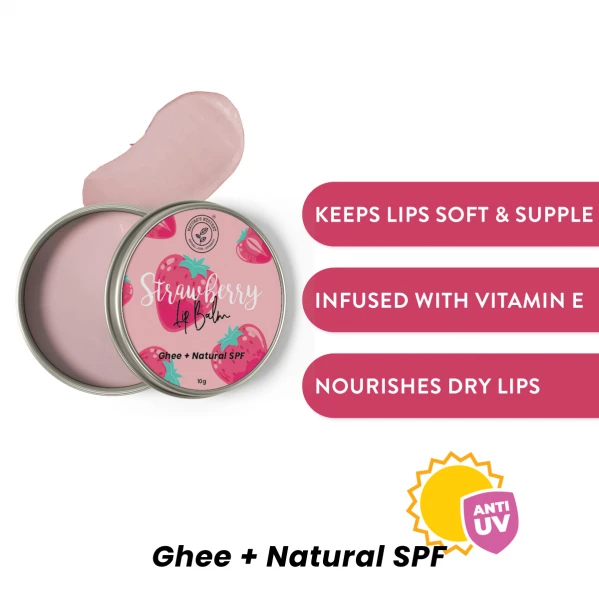Everyone’s all time favorite Strawberry flavored lip balm with a natural tint. Can be used as a lip Balm and a Blush! Our Strawberry lip balm contains Ghee and Natural SPF which will protect lips from UV rays. It also contains Strawberry Butter, Sweet Almond Oil, Avocado Oil which will keep lips pink, super soft and hydrated. And the strawberry smell would make you fall in love with this lip balm!